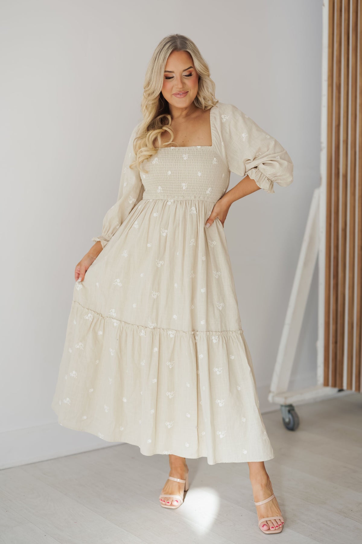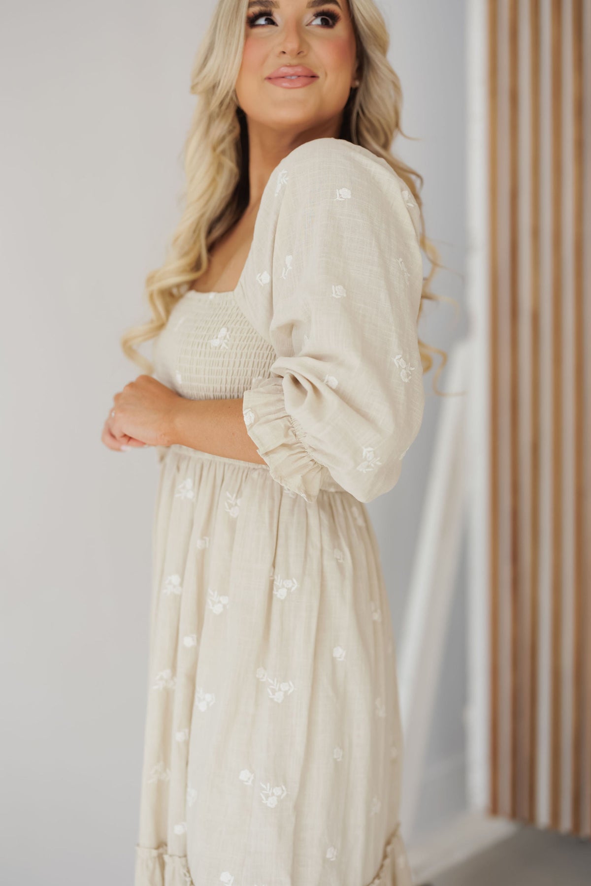 Meet the new "Abby Dress" in sage! This feminine midi dress is a charming and timeless piece to add to your wardrobe! It features a light sage base with white embroidered roses throughout. The long balloon sleeves give an extra feminine and classy feel while the smocked bust and back effortlessly flatters. Style with any flats or heels for an elevated look!