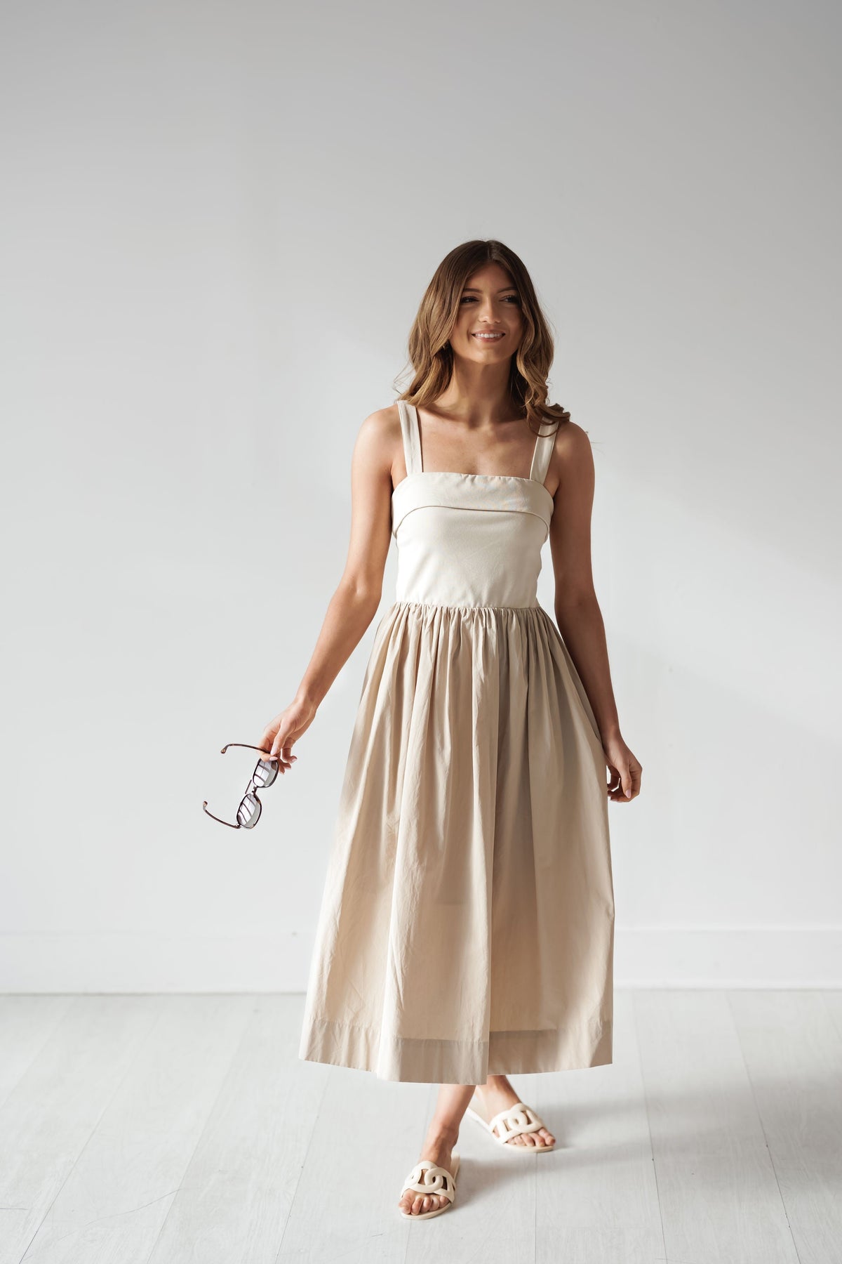 Feel your best in the "Adeline Dress!" This mixed media midi dress is a neutral staple that will carry you through the entire season! Complete with adjustable straps, fold-over neckline, and side pockets, the details in this dress are simply unbeatable! Perfect to pair with any heels!