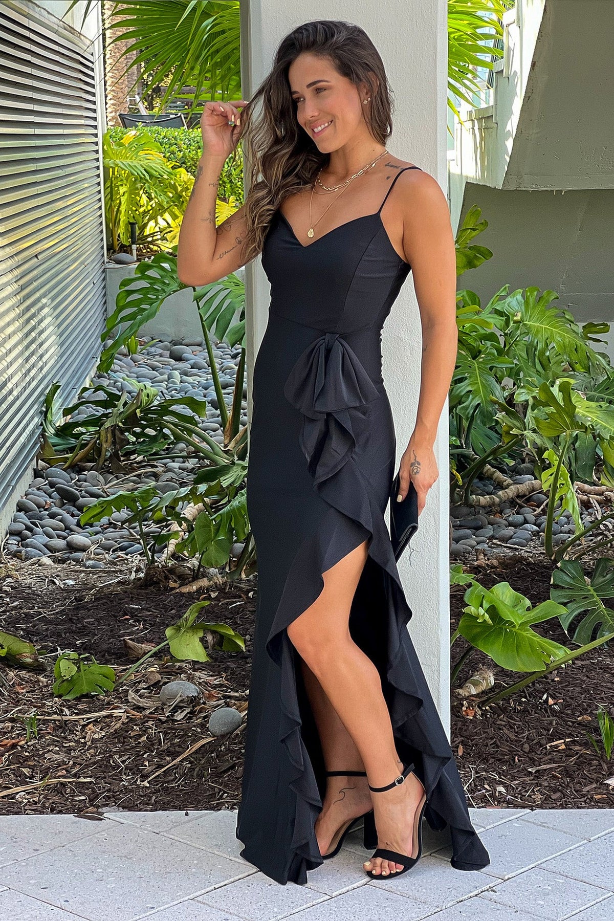 Wow, take a look at this gorgeous Black Maxi Dress With Ruffle Slit that is now available at our online boutique! Elegant and chic formal maxi dress that you can wear to any special occasion! Must have ruffle detail to jazz up the night!