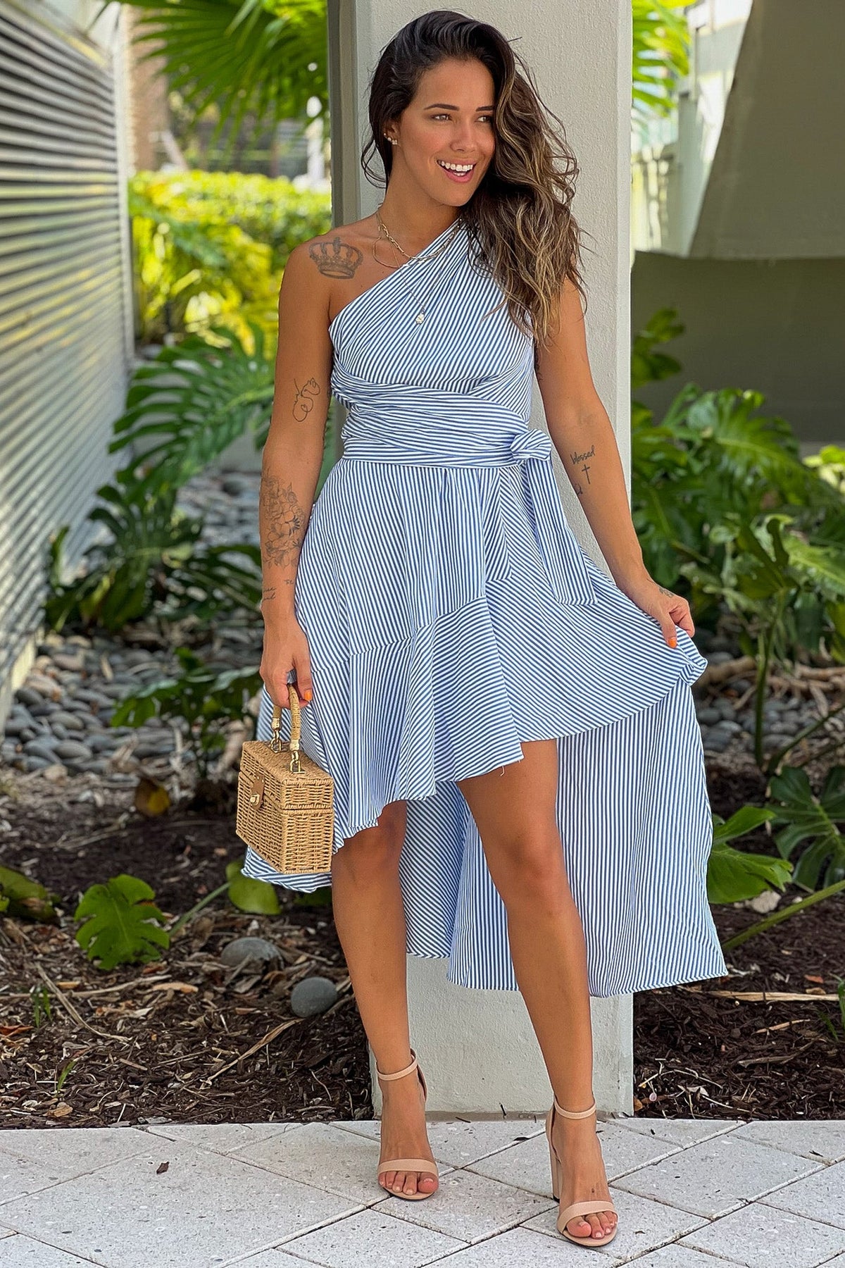 This Blue Striped One Shoulder Dress is so pretty! It features a lovely striped design with an adorable asymmetrical hem and cute self tie belt. Perfect casual dress for Summer!