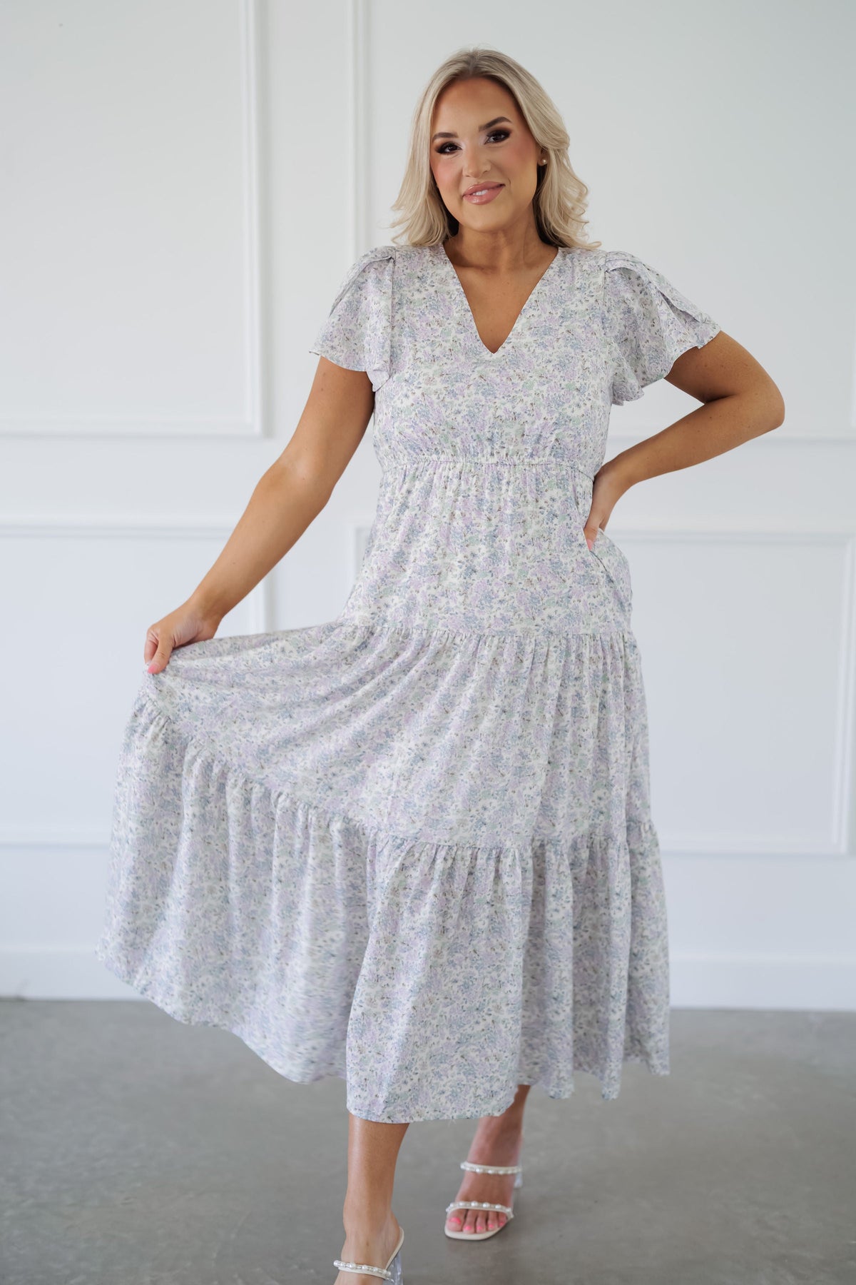 Feel your best in the "Brittany Dress!" This feminine maxi dress is so charming and will leave you feeling effortlessly beautiful! Boasting a purple and green floral print, v-neckline, and tiered maxi skirt, this dress is ideal for church or date night! To style, pair with jewelry and heels!