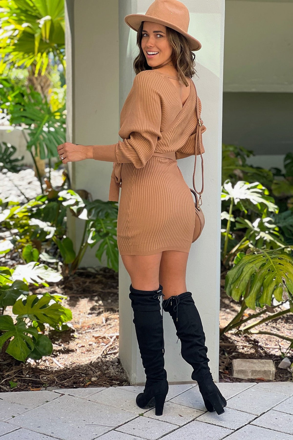 WOW, check out this most comfy and pretty Camel Ribbed Short Dress with Long Sleeves from our online dress shop! We absolutely love its amazing Camel color and awesome ribbed material! Perfect for Fall/Winter season!