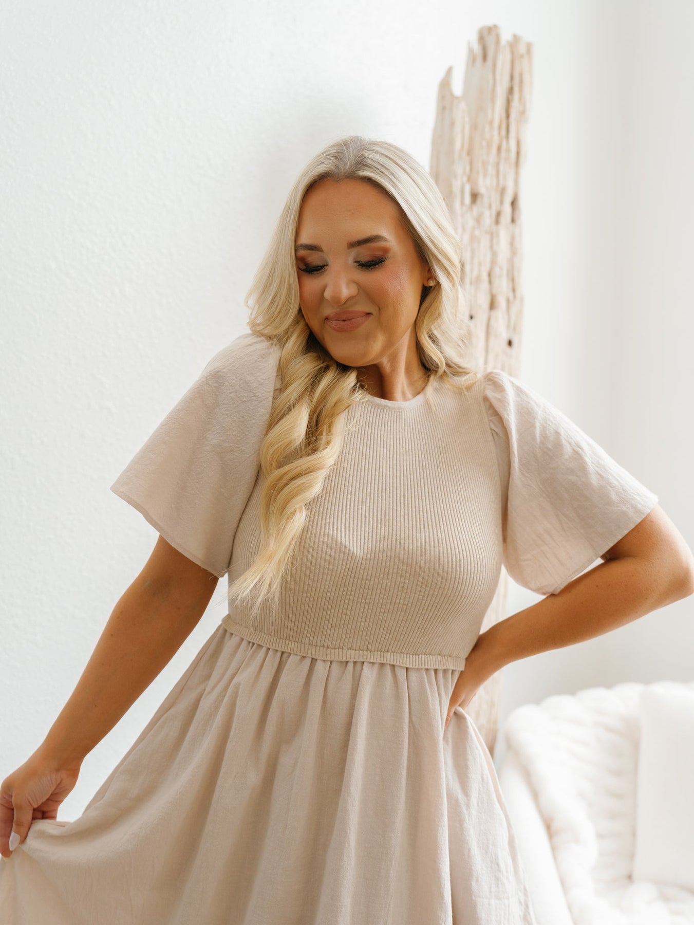 Introducing the natural colored “Carmen Dress!” This charming contrast dress boasts a ribbed knit sweater top with contrasting sleeves and midi length skirt. This dress also features functional side pockets, making it the perfect elevated style for church or date night!