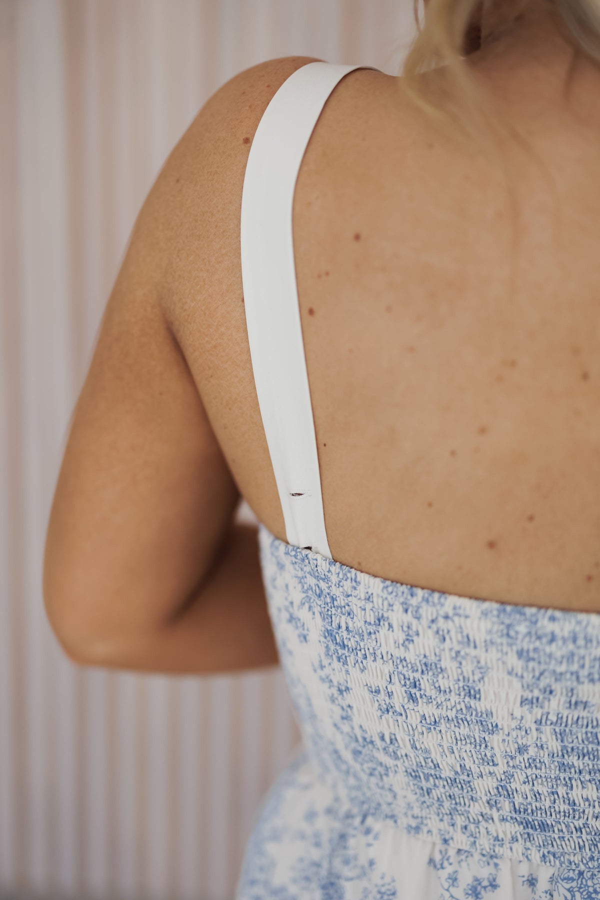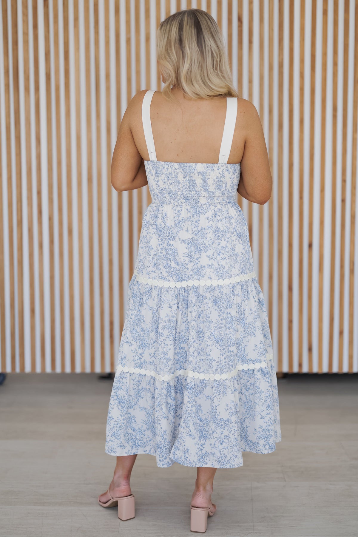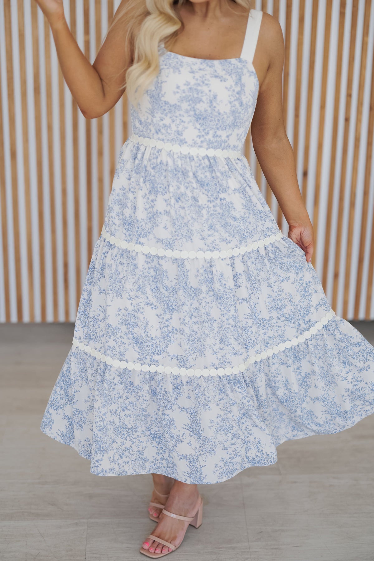 Graceful, airy, and effortlessly romantic, the "Cheryl Dress" is the perfect blend of timeless elegance and modern charm. Featuring a delicate blue and white floral print, this dress exudes a fresh, feminine feel. The white straps provide a crisp contrast, while the intricate circular trim detailing on the tiered skirt adds a unique, elevated touch. Designed with a breezy midi-length silhouette, this dress moves beautifully with every step, making it ideal for brunch dates, garden parties, or summer getaways!