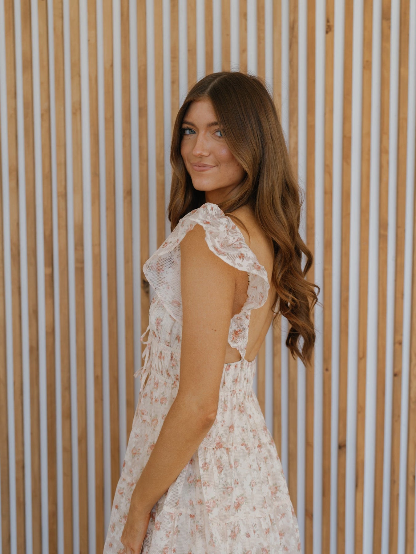 Effortlessly charm in the "Georgia Dress!" Nothing beats this cream and peach midi dress for date night or family pictures. It boasts a plunge v-neckline with ruffled cap sleeves and a midriff keyhole. The gathered empire waist and low open back add to the charming appeal of this dress!