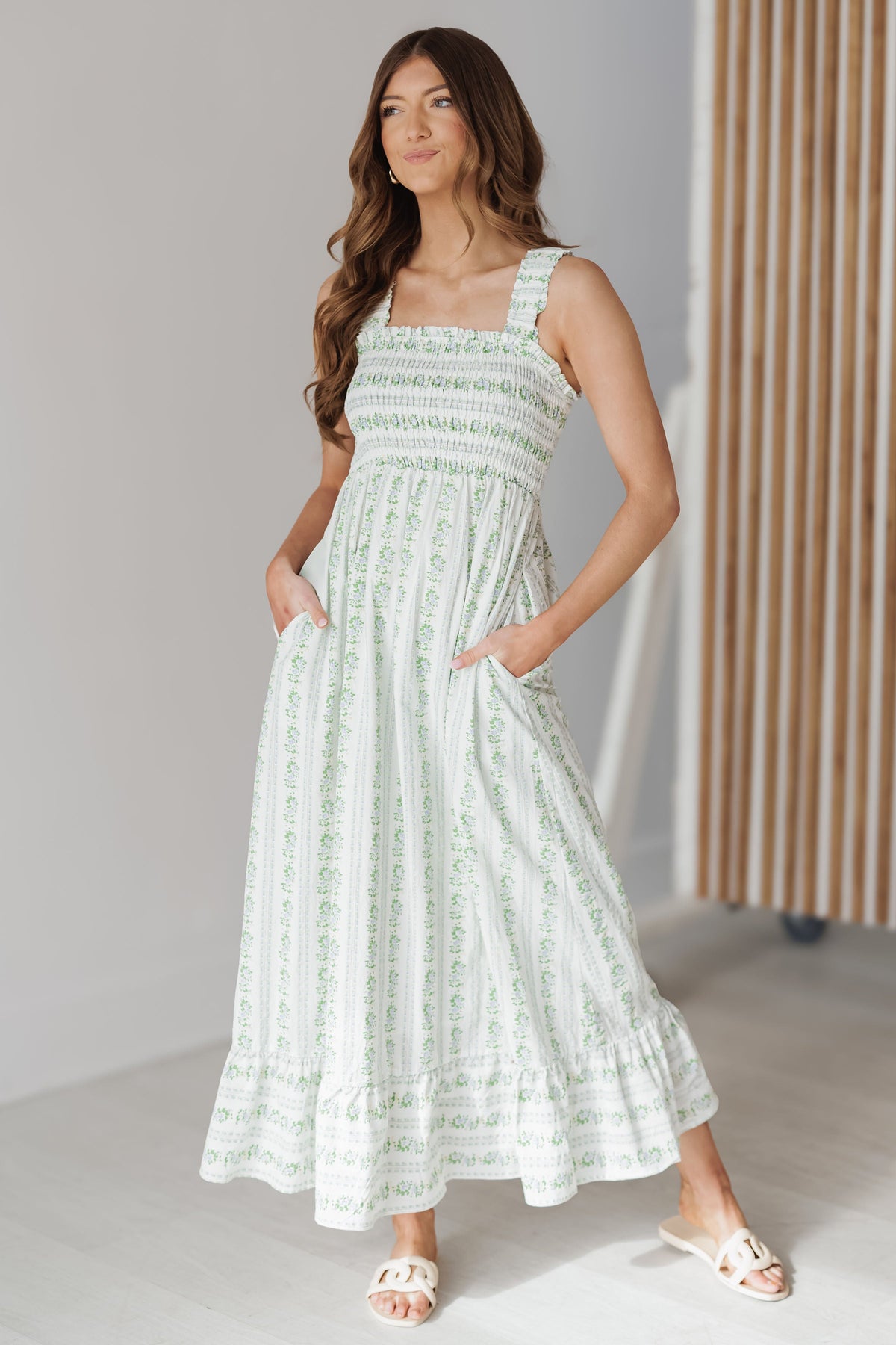 Be ready for spring in the “Haley Dress!” We can’t get enough of this elevated floral maxi dress for date night or church! Boasting a fully smocked bust and back along with elastic straps. The green and blue florals down the maxi length skirt make this a true wardrobe staple for the spring! Pair with any heels or slides to complete the look!