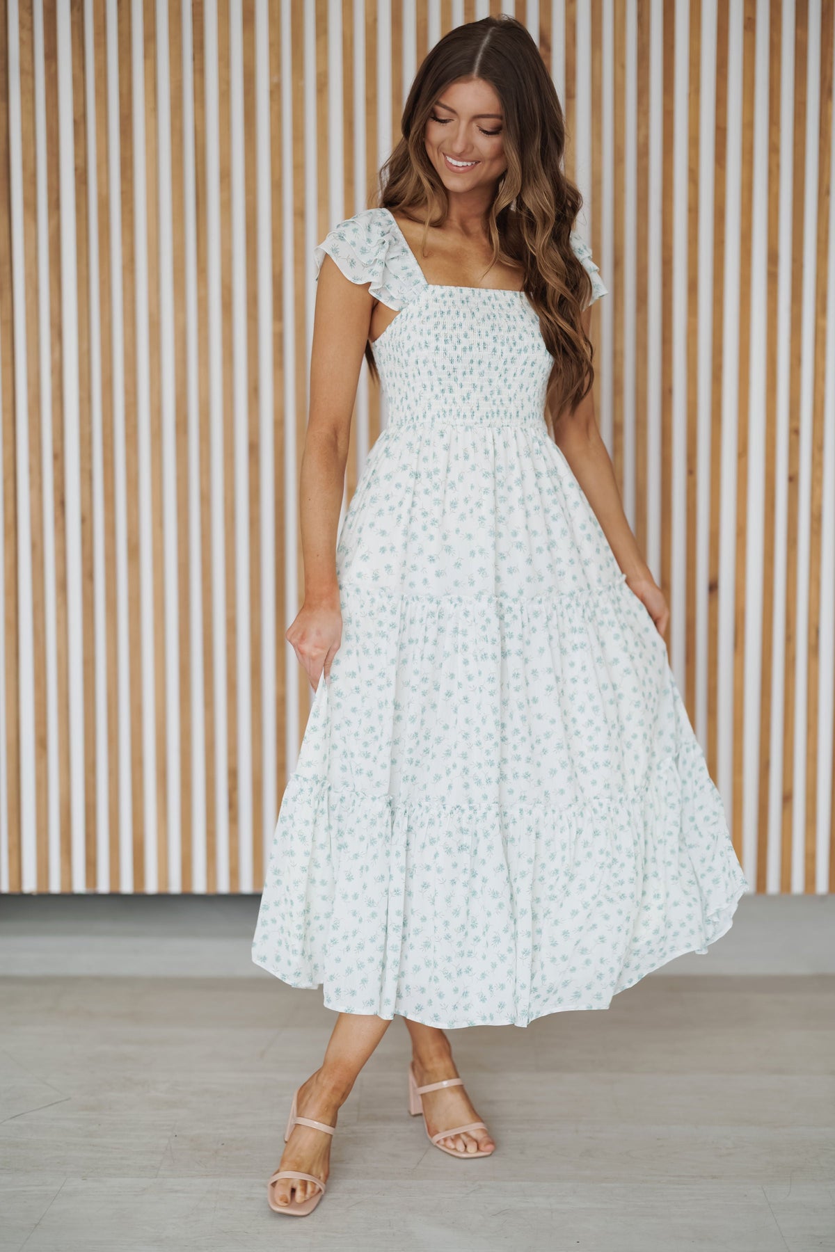 Float through your day in effortless elegance with our "Kaia Dress" in jade! Designed for romance and charm, this dreamy piece features a delicate floral print that adds a soft, feminine touch. The smocked bodice offers a flattering, flexible fit, while ruffled flutter sleeves bring a hint of whimsy. The tiered midi skirt creates graceful movement with every step, making it perfect for garden parties, brunch dates, or a romantic evening out. Pair it with strappy sandals for a breezy daytime look or dress it up with heels for a touch of sophistication.