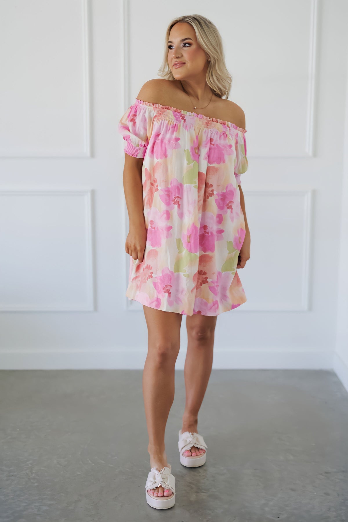 The "Karson Mini Dress" features a dreamy watercolor floral print in vibrant shades of pink, coral, and soft green against a light cream background! The design showcases elegant smocked detailing at both the neckline and sleeve cuffs, creating a perfectly gathered silhouette that flatters the upper body. This feminine dress captures the essence of summer with its romantic floral pattern and effortlessly chic design!