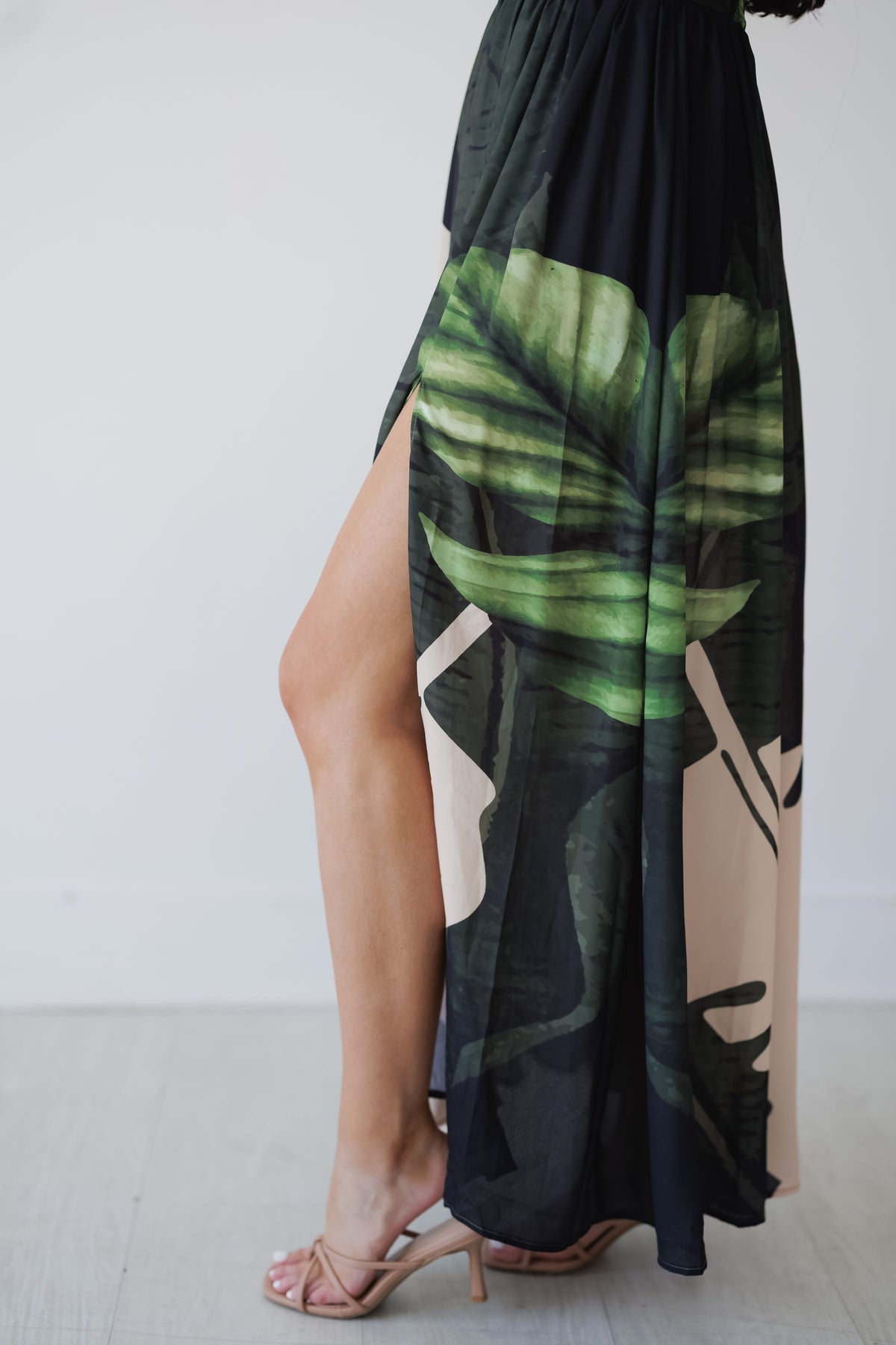 The "Kathleen Dress" features a striking tropical leaf print in deep olive green and cream, creating a bold statement piece for warm-weather occasions. The sophisticated halter neckline with crossover detail draws attention to the collarbone and shoulders, while the cinched waistband defines the silhouette beautifully. Crafted from flowing fabric that catches the breeze, the full skirt includes a subtle front slit that adds movement and practicality. Perfect for destination weddings or upscale resort dining, this eye-catching dress combines contemporary botanical aesthetics with timeless feminine grace!