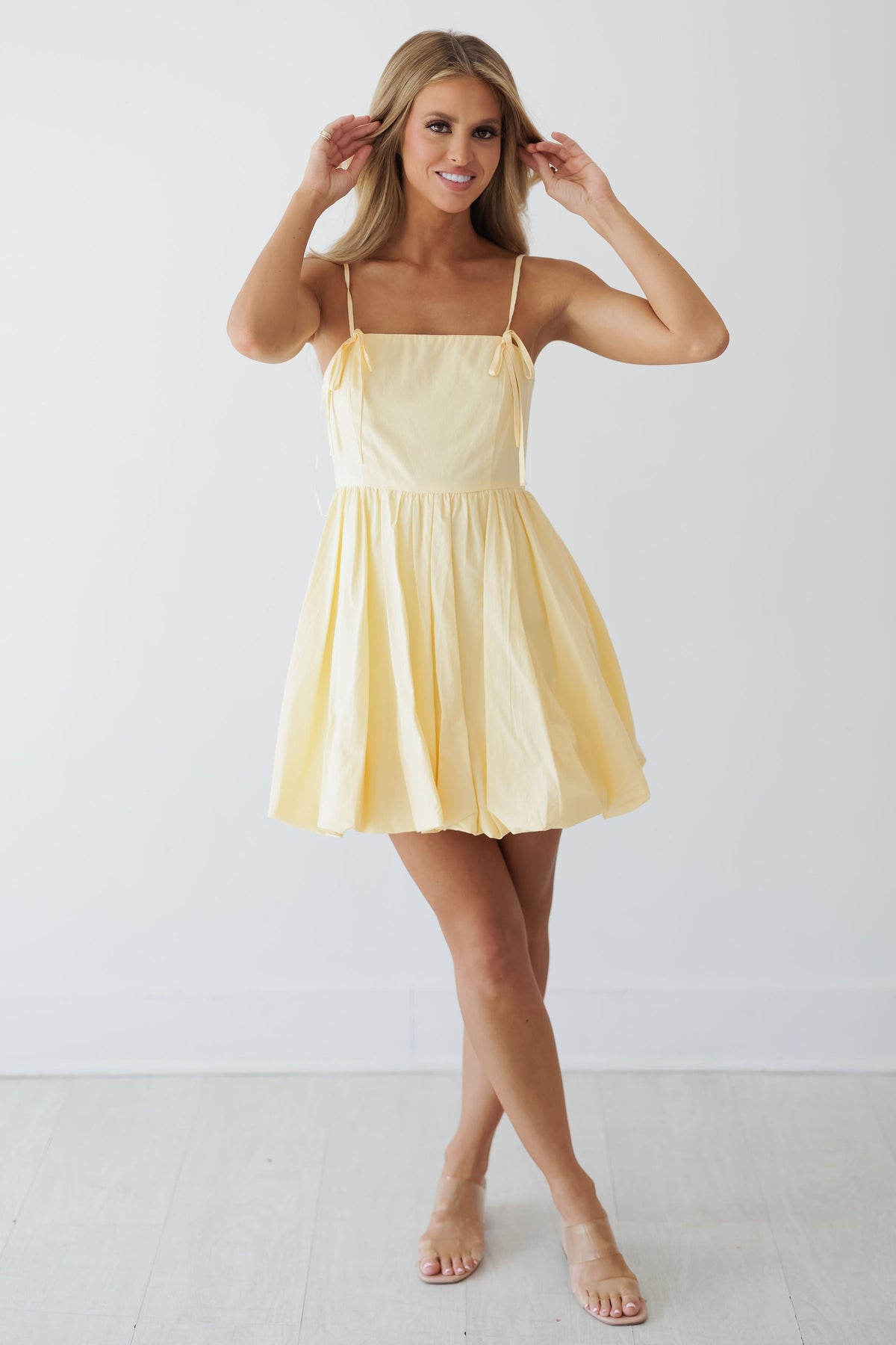 Introducing the “Kenley Mini Dress!” This playful bubble hem dress adds a fun and flirty twist to your wardrobe! With delicate straps and a relaxed fit, this piece is both stylish and comfortable. The adjustable shoulder ties allow for a custom fit, making it perfect for various occasions. Its voluminous bubble hem creates a playful, eye-catching silhouette that is sure to turn heads!