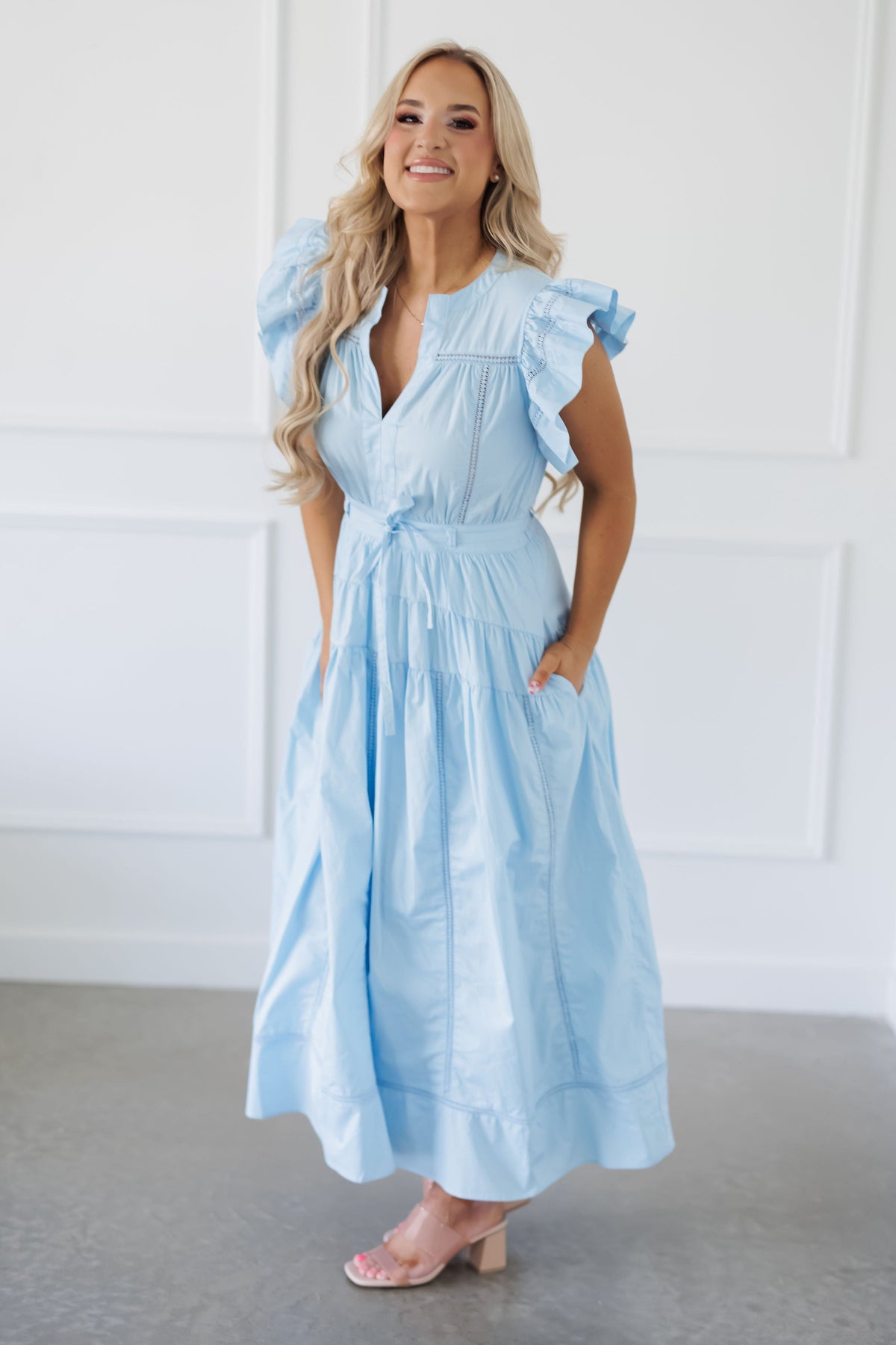 This enchanting sky-blue midi dress exudes effortless charm with its delicate ruffle sleeves and intricate lace detailing!  Designed with a flattering fitted waist and a tiered skirt, it creates a beautifully flowing silhouette perfect for any occasion. The breathable, lightweight fabric ensures all-day comfort, making it a go-to choice for warm-weather outings. Pair it with sandals for a casual daytime look or elevate it with heels for an elegant evening ensemble!