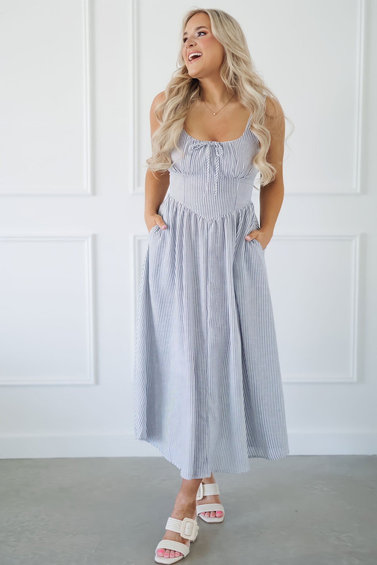 The "Lainey Dress" features a delicate navy and white pinstripe pattern with a fitted bodice and drawstring detail at the chest! The feminine design includes a scoop neckline with a subtle bow accent and flows into a graceful A-line skirt at midi length! Made from a lightweight fabric, this vintage-inspired piece offers both breathability and timeless appeal, perfect for summer gatherings, garden parties, or beach outings, while versatile enough to be styled with various accessories for both casual and semi-formal occasions!