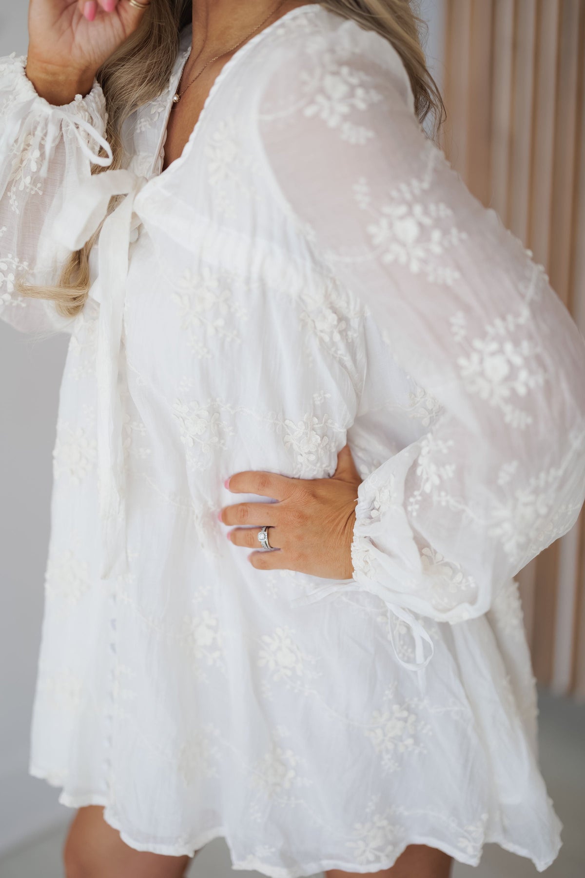 Prepare to turn heads in the ivory colored "Maisy Dress!" An effortlessly charming option for church or date night, this ensemble is so elevated and versatile! Boasting sheer balloon sleeves, embroidered florals, and a v-neckline. To style, pair with heels or boots to complete the look!