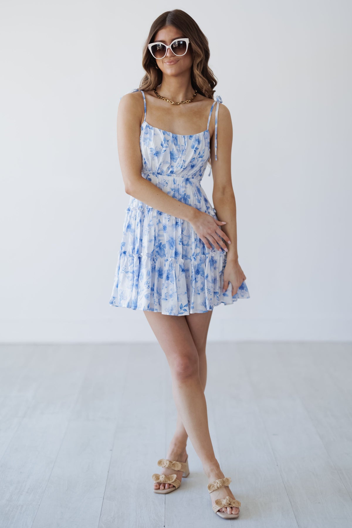 Introducing the "Mckenna Mini Dress" in blue! This dress is effortlessly feminine and such a timeless staple for everyday wear in the spring! Boasting a fitted top with flowy, roomy skirt, this dress is comfortable for all day wear! The self tie straps allow this dress to fit you perfectly! Style with sandals or boots!
