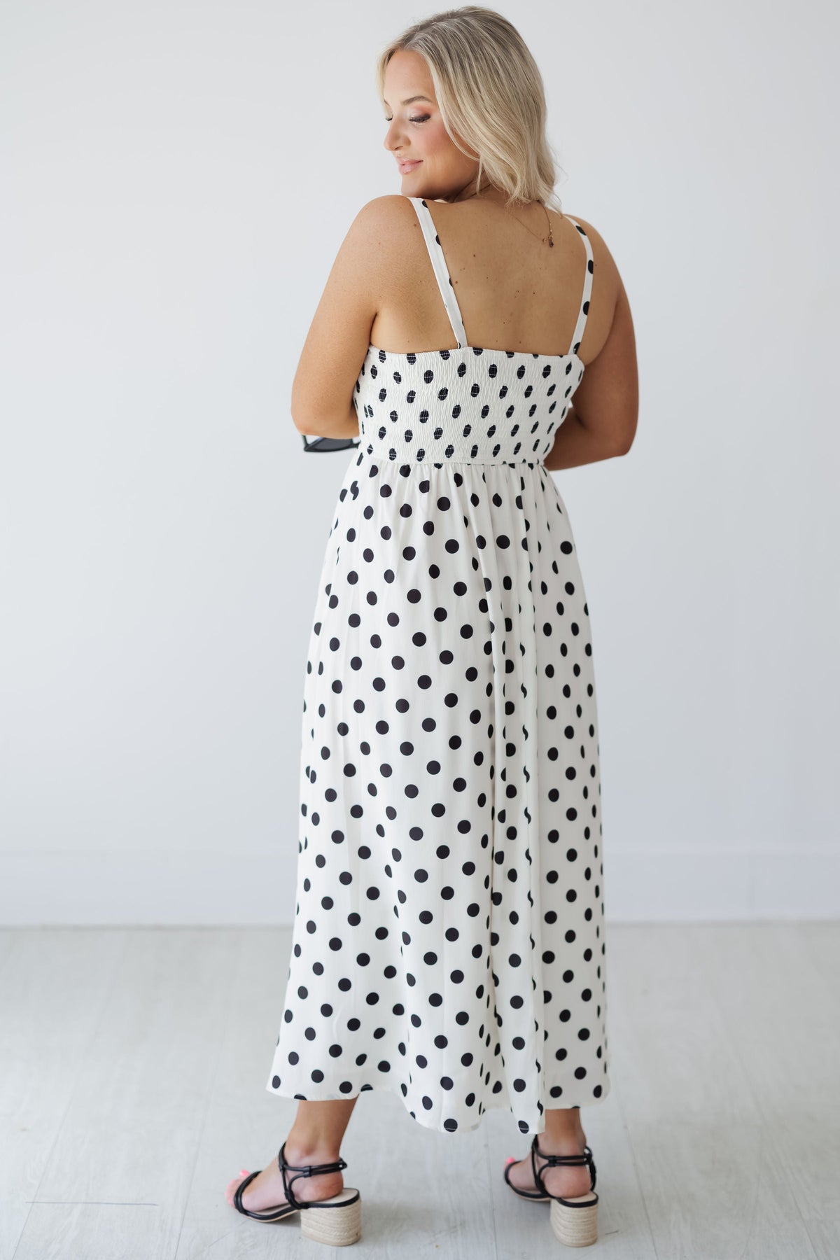 The "Melissa Dress" features a classic cream background with bold black spots for timeless retro charm. The smocked bodice offers both structure and comfort, while the thin straps are sure to keep you cool. The flowing A-line skirt creates an effortlessly feminine silhouette that's perfect for summer outings, brunches, or casual evening events. This versatile piece pairs beautifully with both minimalist accessories for a sophisticated look or bright statement pieces for a more playful ensemble!