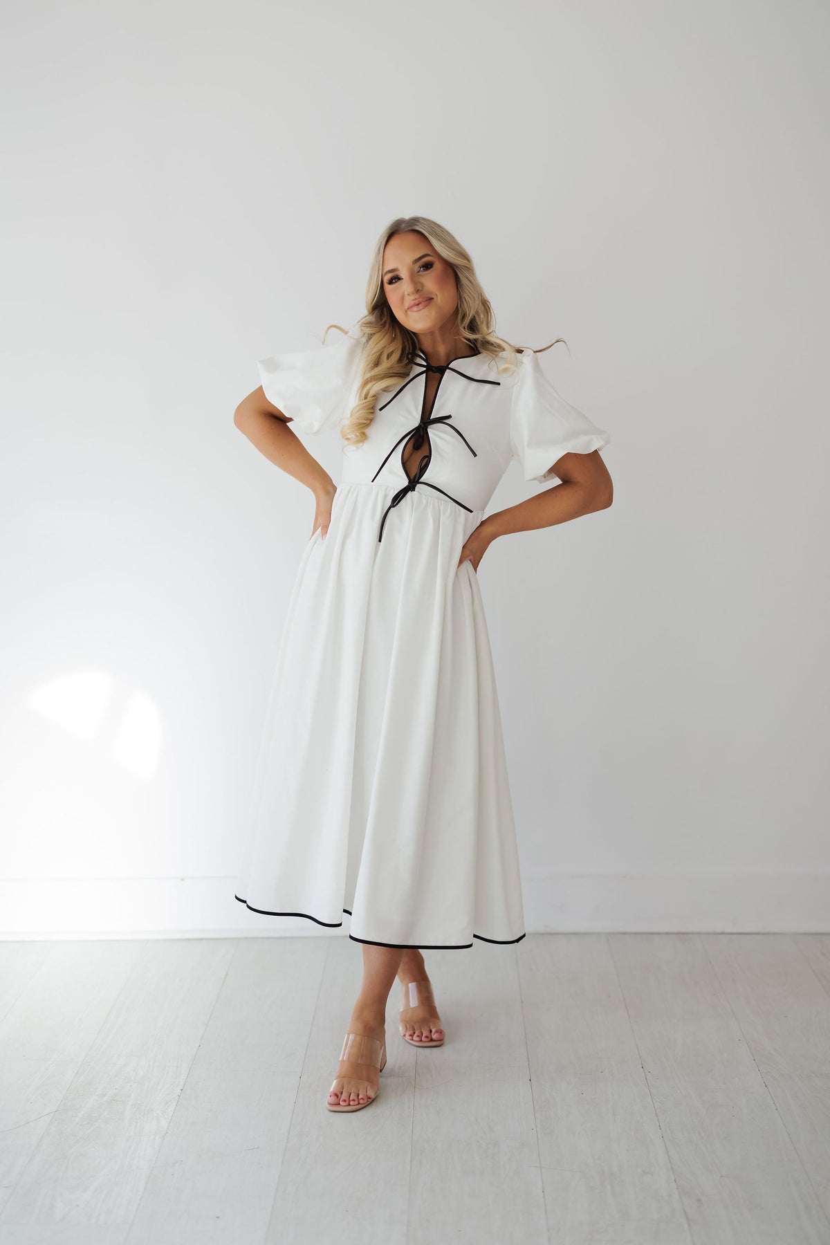 Be effortlessly feminine in the "Perry Dress!" Stunning and versatile are two words that we would use to describe this midi dress! It features a white base with short puffed sleeves and a flowy midi skirt! The black outlining along the chest adds the perfect pop of contrasting color while it ties the front together!