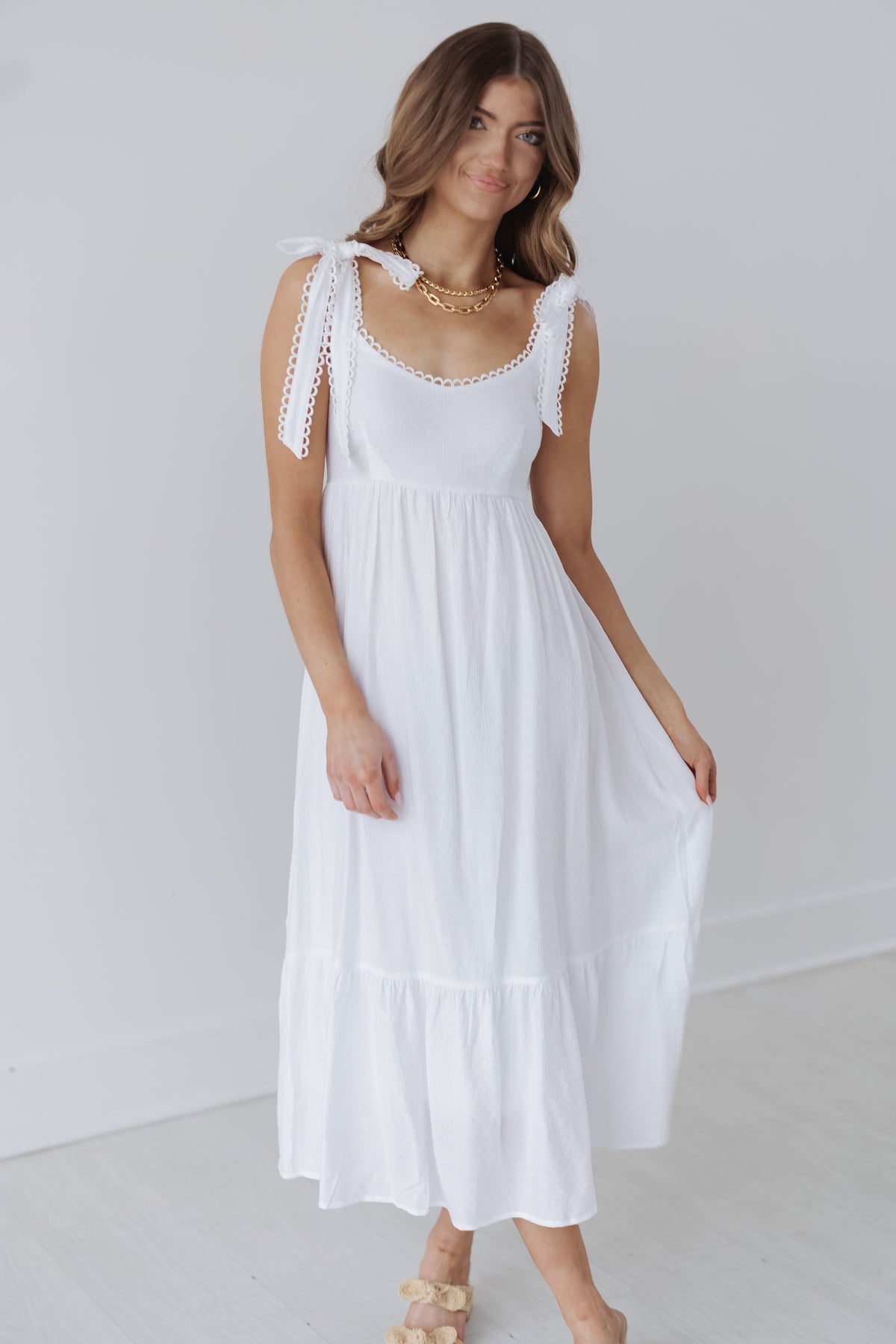 Enjoy timeless styles like the "Phoebe Dress!" A true vacation staple, this white midi dress is so versatile and perfect for any kind of spring occasion! It features scalloped eyelet trim along the self tie sleeves and neckline, along with a flowy midi skirt with ruffled bottom! Easily wear this dress with any sandals!