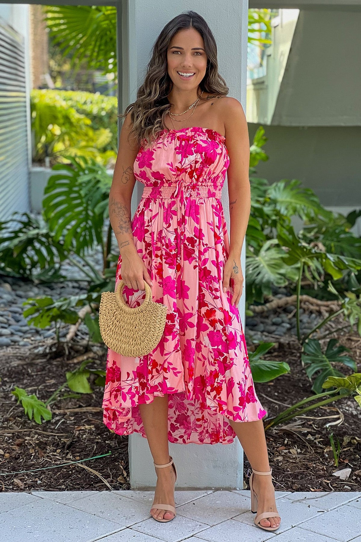 We are so excited to bring this adorable Pink Floral Print High Low Dress to our online boutique! Check out its gorgeous floral print and summerly color combo! A perfect dress to add to your casual wardrobe!