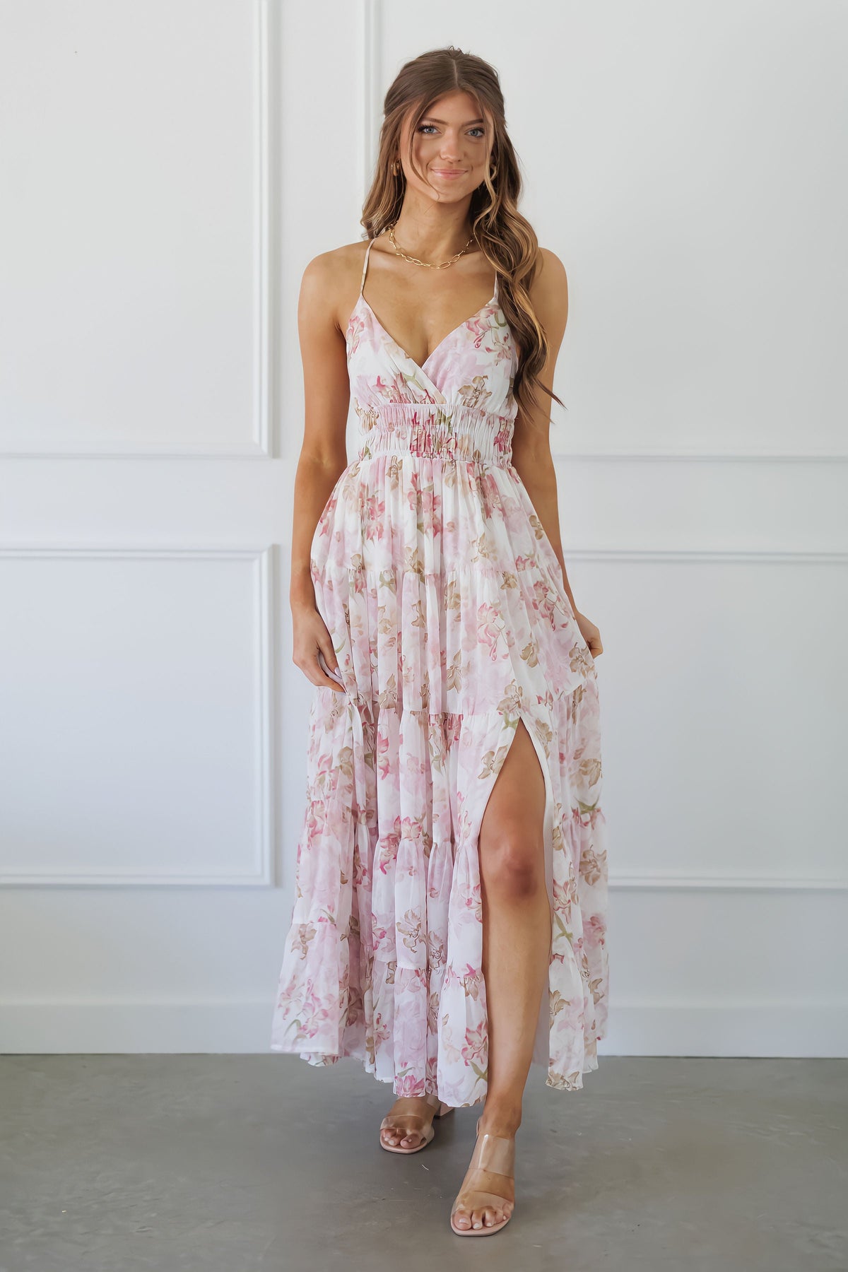 This romantic tiered maxi dress features a delicate white background adorned with soft pink and beige floral prints, creating an ethereal garden-inspired look! The dress boasts a smocked bodice that provides both structure and comfort, while its multi-tiered skirt design adds movement and whimsical flair. Made from lightweight fabric, this dress offers breathability perfect for warm-weather occasions from garden parties to vacation getaways. The adjustable shoulder straps allow for a customized fit, while the flowing silhouette effortlessly flatters! This versatile piece can be dressed up with jewelry for special events or paired with sandals and a straw hat for casual daytime outings, making it a must-have addition to any summer wardrobe!