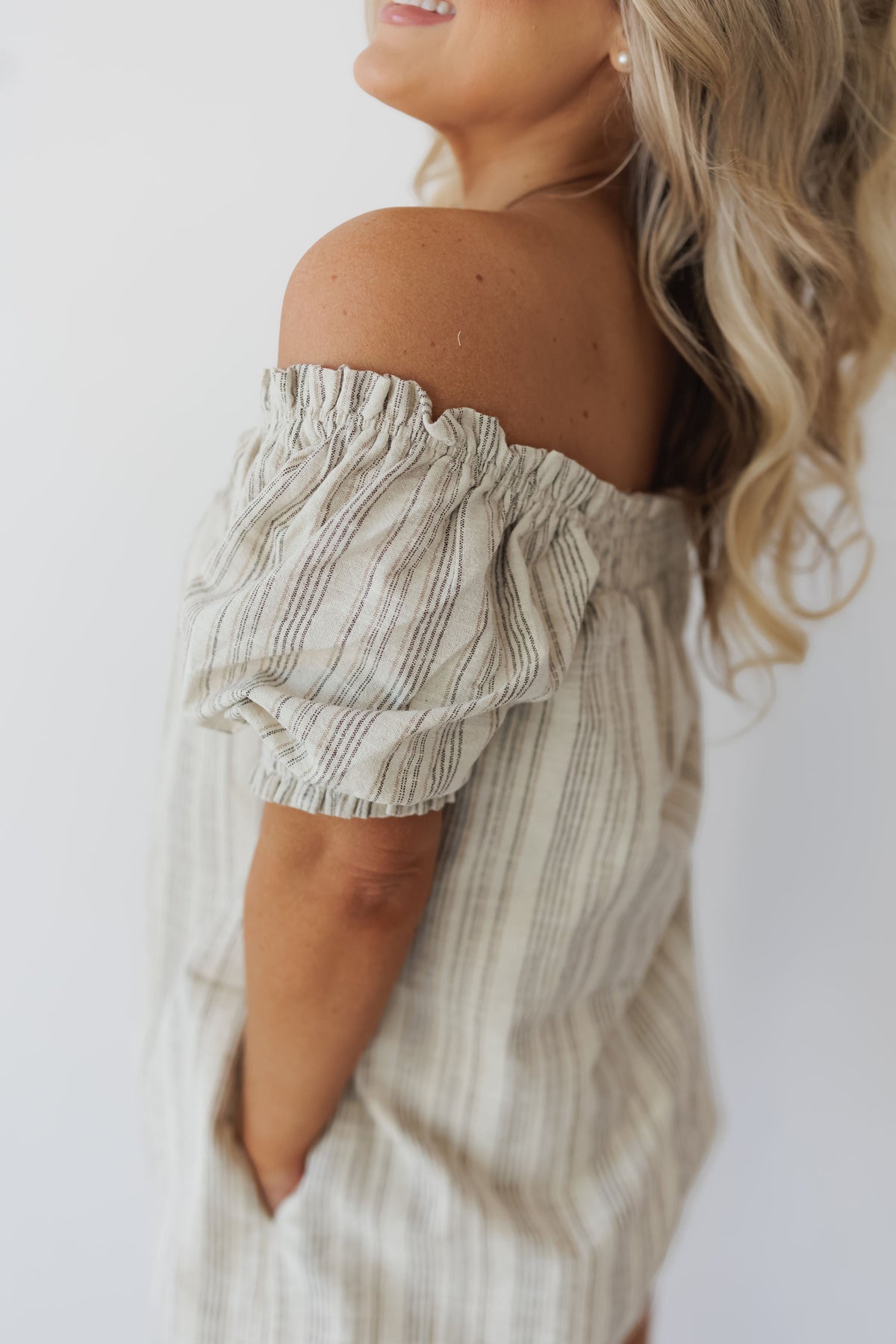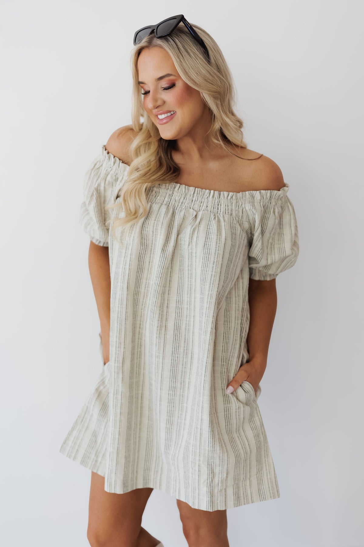 Feel your best in the "Sarah Mini Dress!" Nothing beats an elevated mini dress for enhancing your spring wardrobe! This dress boasts off white and grey stripes, a square neckline, and short puffed sleeves. The relaxed fit makes this the perfect casual dress for pairing with sandals!