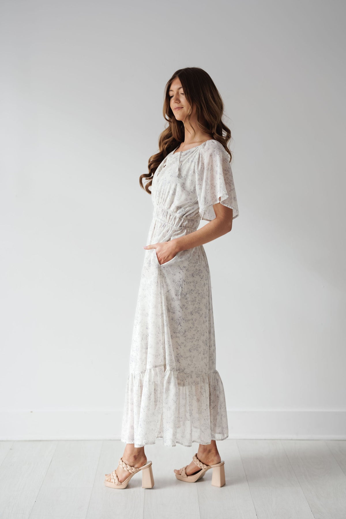 Meet the new "Sophia Dress" in blue/cream! Nothing beats a classic midi dress and this one is so perfect for dressing up your date night! Boasting a cream base with dainty blue floral detailing, along with short flutter sleeves and an elastic waistline, this dress is a total head turner! The relaxed skirt features a feminine ruffled bottom.
