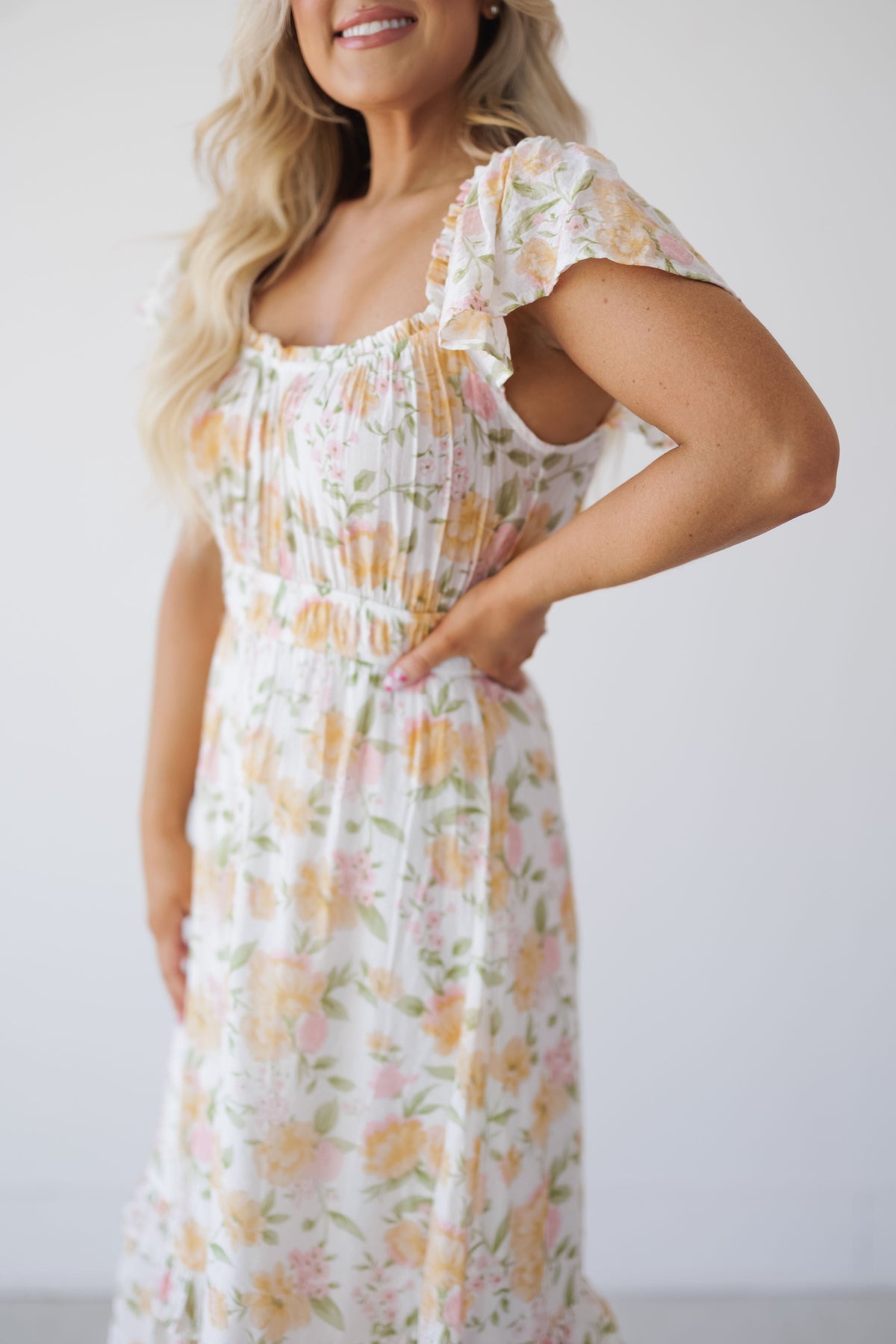 Step into a world of effortless charm with the "Vienna Dress," perfect for warm, sunny days. Crafted from lightweight, airy fabric, this dress features a dreamy yellow and pink floral print on a soft white base, exuding a romantic, vintage-inspired feel. The smocked bodice offers a flattering, flexible fit, hugging your shape while ensuring all-day comfort. With ruffled short sleeves that can be worn on or off the shoulders, this dress allows for versatile styling. The flowy midi-length skirt moves gracefully with every step, finished with a delicate ruffled hem for an extra touch of femininity!