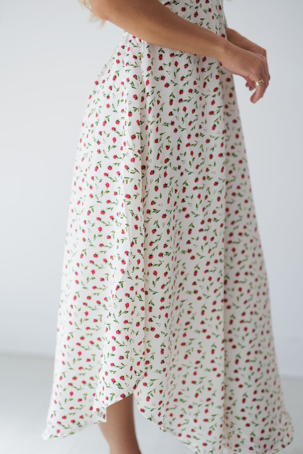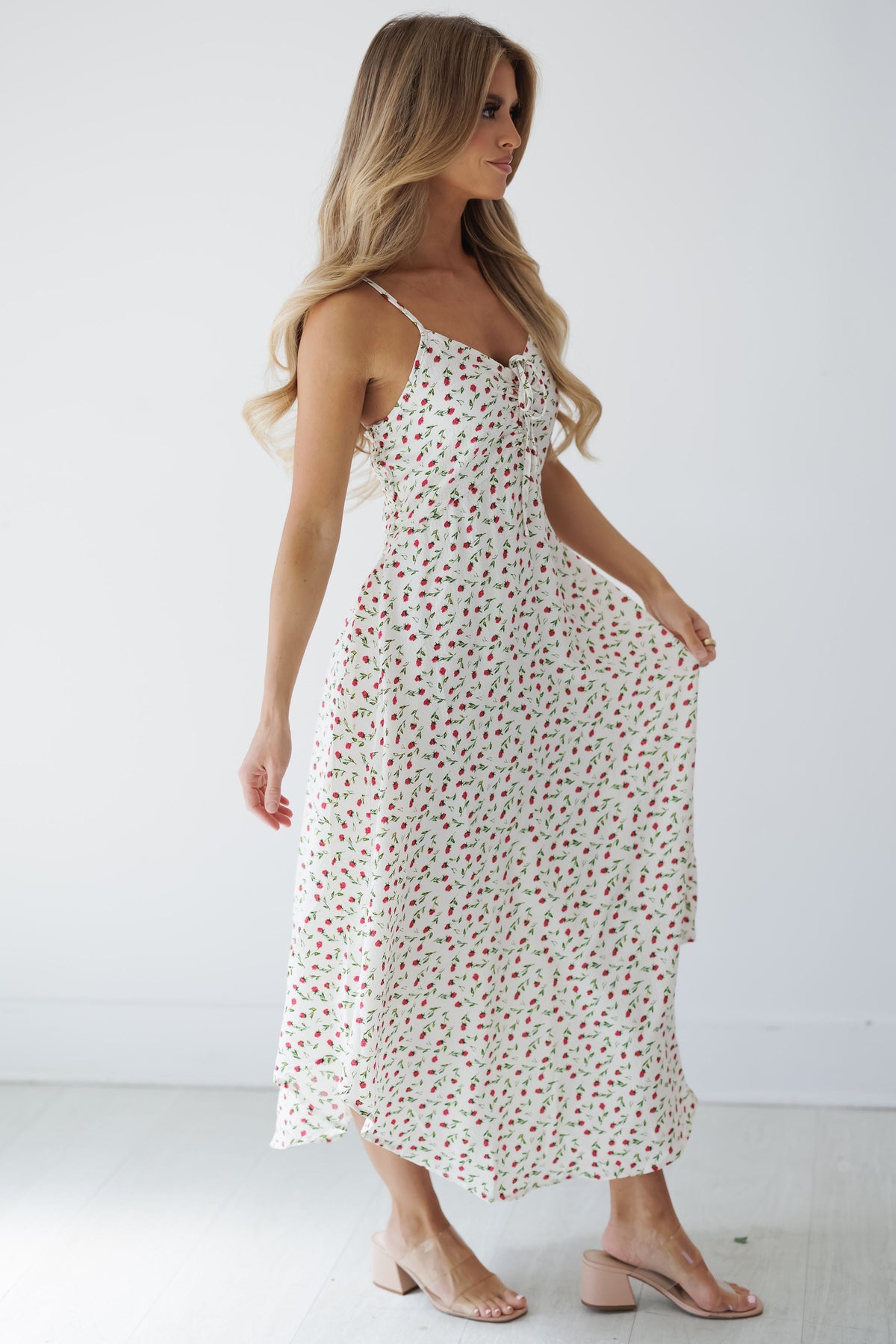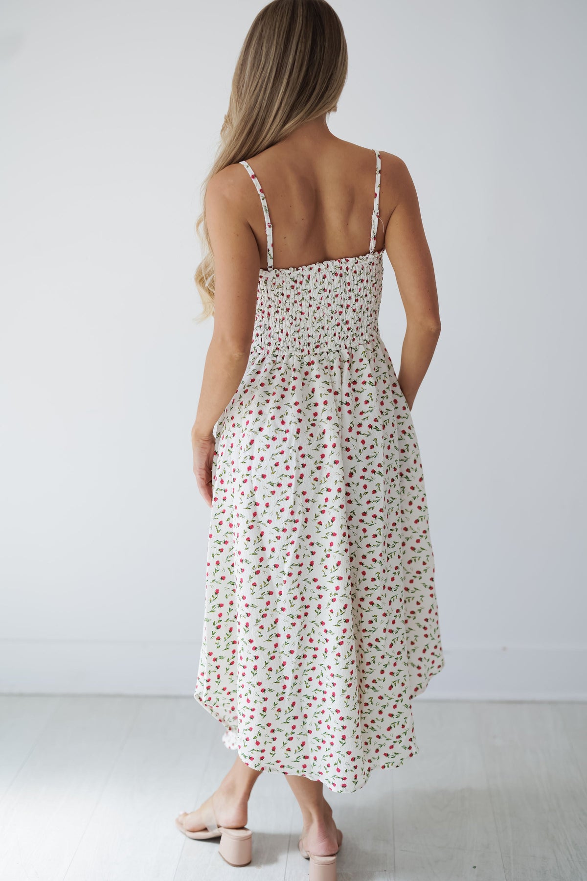 Introducing the "Yvette Dress!" This charming sundress features a delicate pattern of tiny red rosebuds scattered across a cream background for a sweet, vintage-inspired look. The feminine front tie detail adds visual interest while the comfortable straps and flowing silhouette ensure all-day wearability for various summer activities. The lightweight fabric creates elegant movement with every step, making this dress perfect for garden parties, picnics, or casual weekend outings!